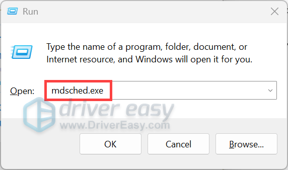 - Press Win + R simultaneously to open the Run box. Type or paste mdsched.exe and hit Enter.
