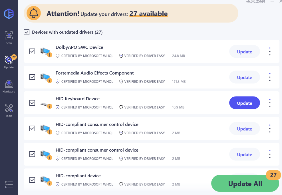 Or click Update All to automatically download and install the correct version of all the drivers that are missing or out of date on your system (You’ll need the Pro version for this – when you select Update All, you’ll get a prompt to upgrade. If you’re not prepared to purchase the Pro version yet, Driver Easy provides a 7-day trial at no cost, granting access to all Pro features like fast downloads and easy installation. No charges will occur until after your 7-day trial period ends.)