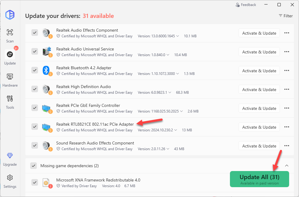 (This requires the Pro version which comes with full support and a 30-day money-back guarantee. You’ll be prompted to upgrade when you click Update All. If you’re not ready to buy the Pro version, Driver Easy offers a 7-day free trial which includes access to all the Pro features such as high-speed download and one-click install. You won’t be charged anything until your 7-day trial has ended.)