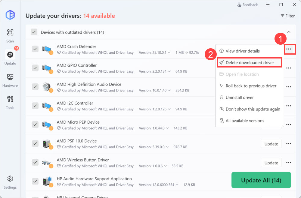 - Click the ellipsis icon next to the Update button of a driver that you have downloaded (partly or fully), then click Delete downloaded driver.