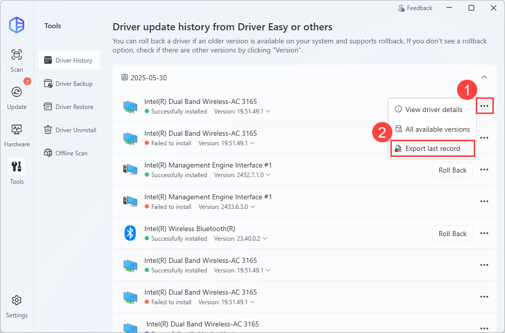 In the Driver History screen, Pro users can click the ellipsis icon and select Export last record to export the last driver update record to a .txt file.