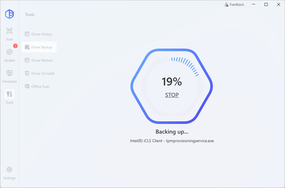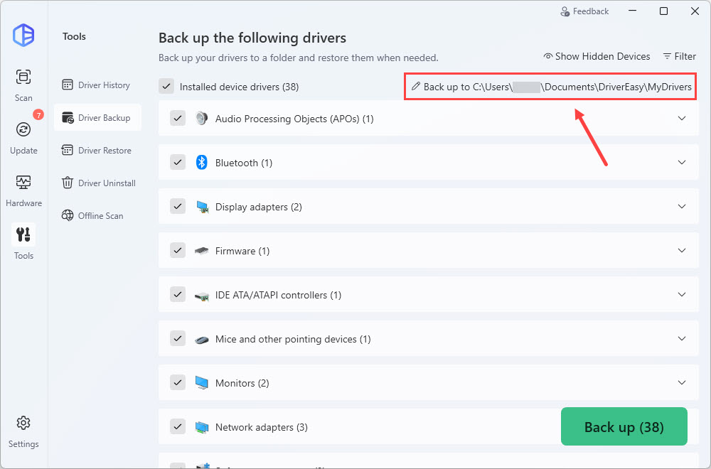 - Under the Driver Backup section, select the drivers you want to back up, then click Back up. The drivers you selected will be backed up to the following path by default: