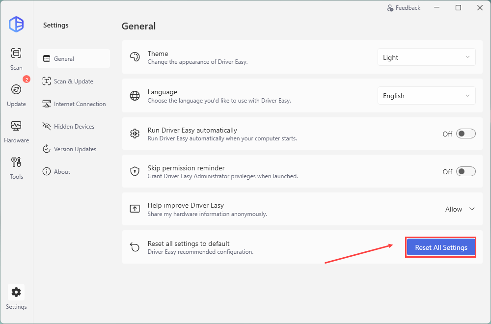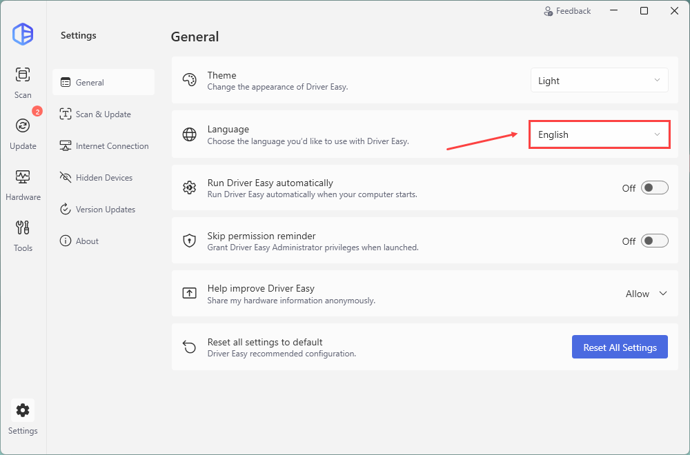 You can modify the general program settings of Driver Easy, such as the theme, language, and permission settings, to suit your needs.