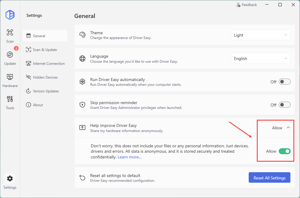Help improve Driver Easy: If this setting is enabled, you help us improve Driver Easy by providing us with your hardware information.
