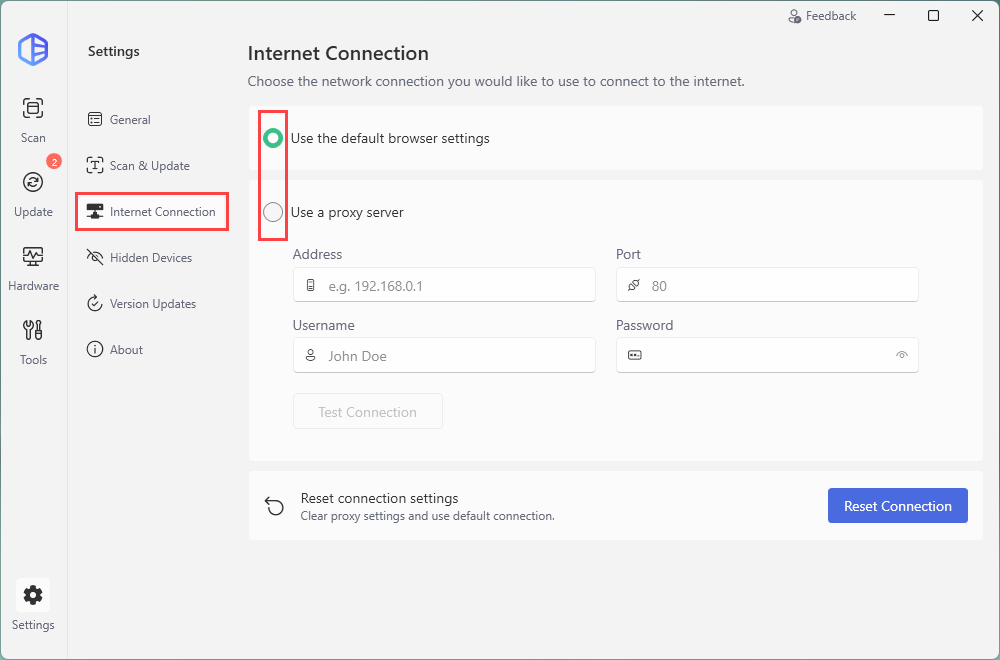 You can choose how you want Driver Easy to connect to the Internet. By default, Driver Easy uses the Internet Explorer settings to access the Internet. But you can still let Driver Easy access the Internet via a proxy server.