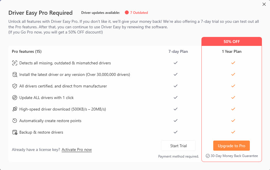 Click Start 7-day Trial to try Driver Easy Pro for free.