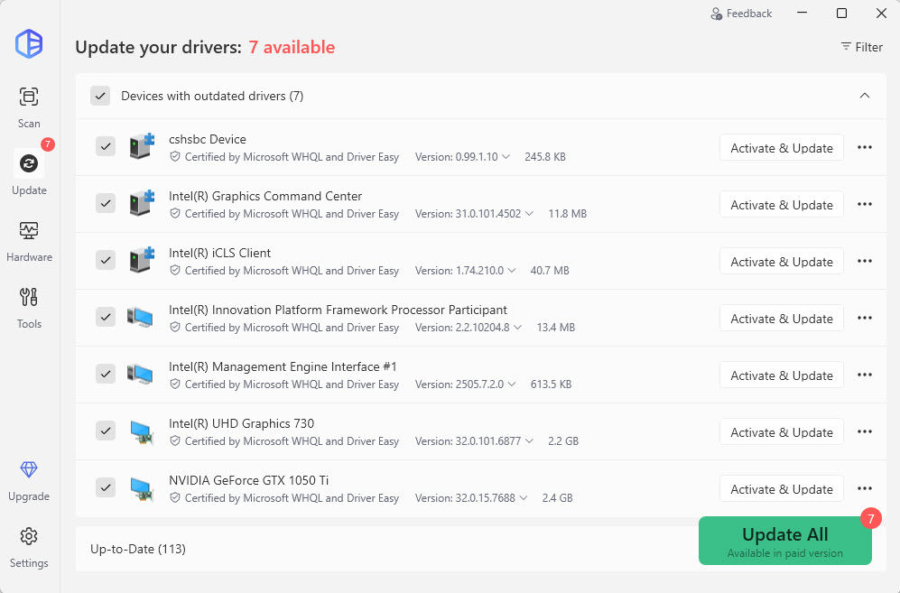 Click the Activate & Update button next to any flagged device or click Update All to update all the outdated drivers. You can sign up for the free trial to update drivers with no upfront cost.
