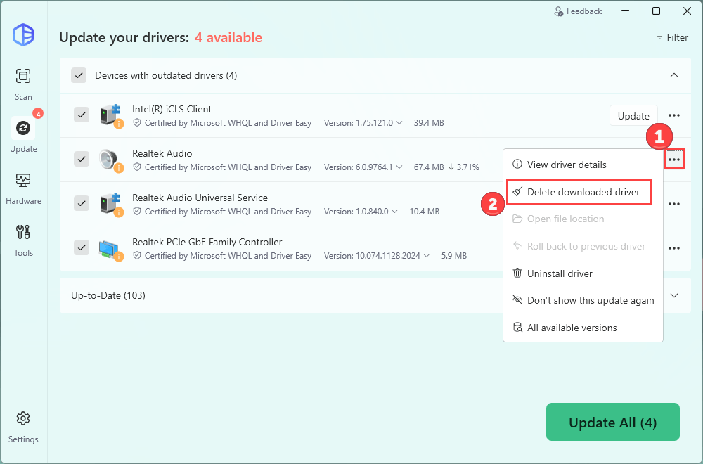 1. Click More actions next to the Update button, then select Delete downloaded driver.