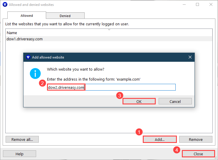 3) Follow step 2) to add dow2.drivereasy.com. Then click Close to save the allowd websites list.