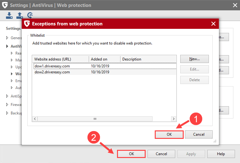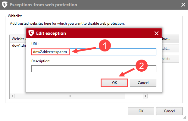 To resolve this issue, you need to add dow1.drivereasy.com and dow2.drivereasy.com to the exception list of G DATA INTERNET SECURITY. Here is how to do it: