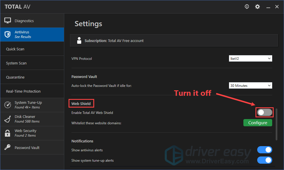 Currently, you can temporarily turn off the web shield feature in TOTAL AV so that you can download drivers with Driver Easy. Here is how to do it: