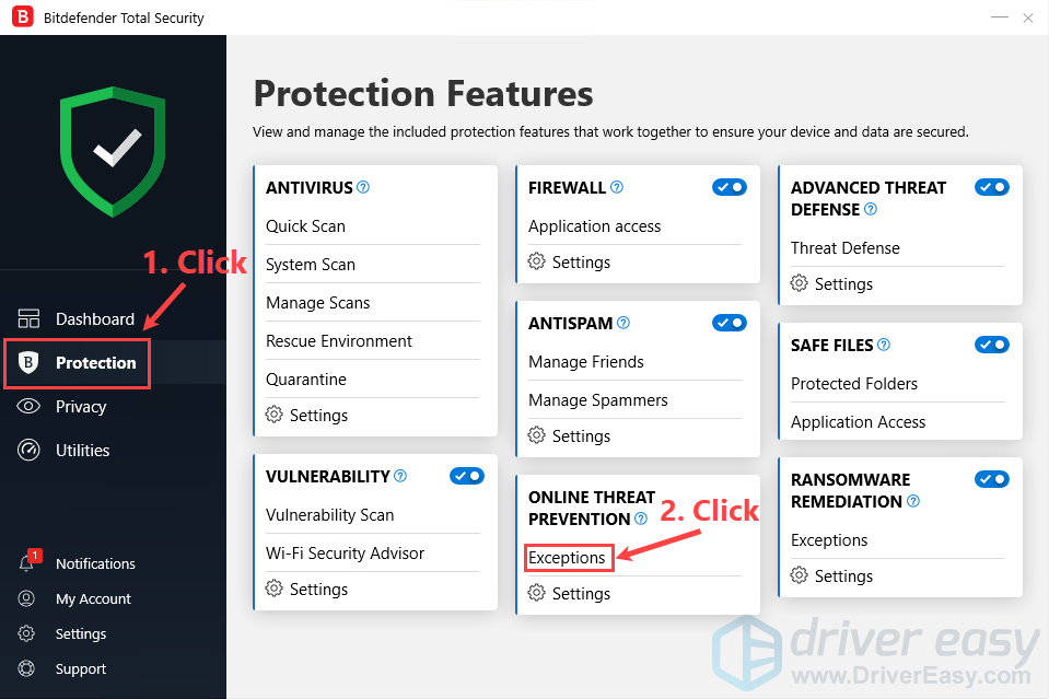 1) In Bitdefender, Navigate to the Protection panel. Then select Exceptions in the ONLINE THREAT PREVENTION section.