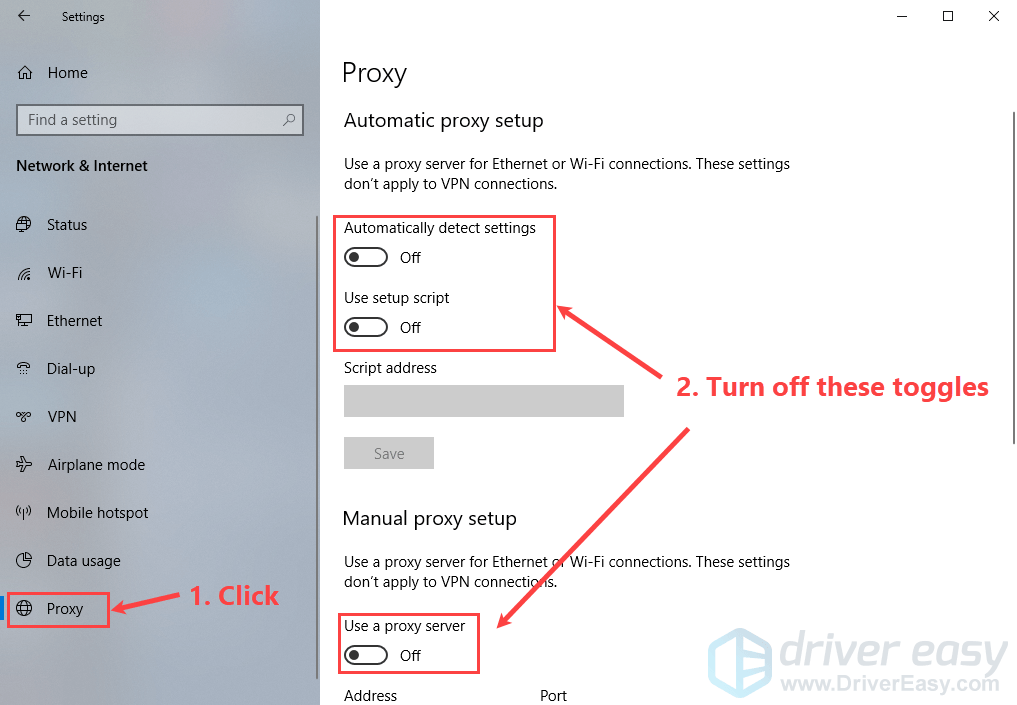 2) On the left panel, click Proxy. Make sure the toggles under Automatically detect settings, Use setup script and Use a proxy server are turned off.