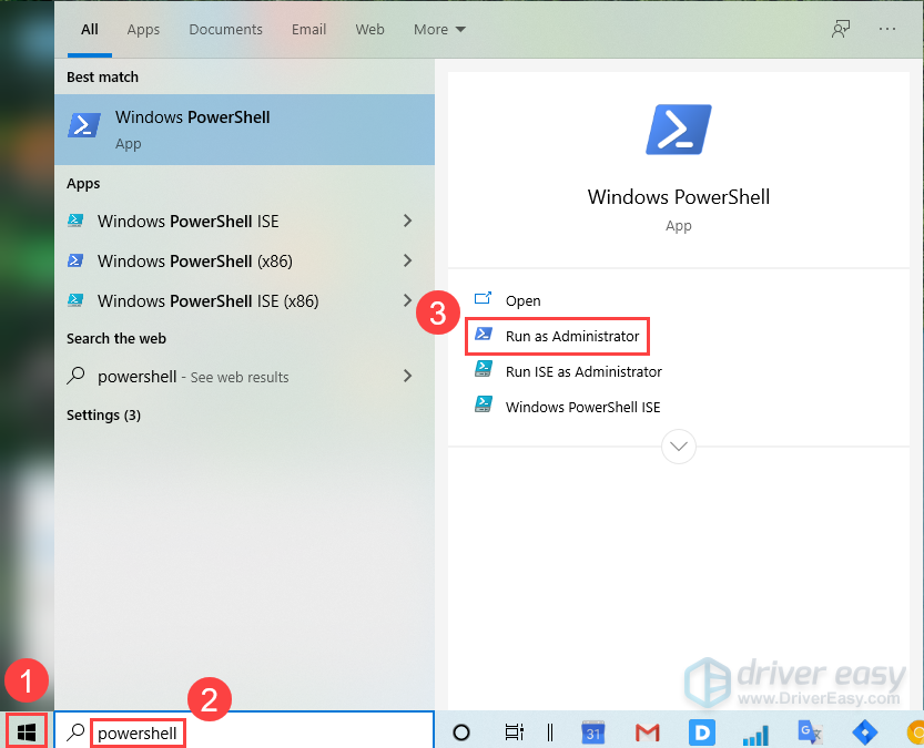1) Click the Windows Start menu and type powershell in the search box. Then select Run as Administrator.