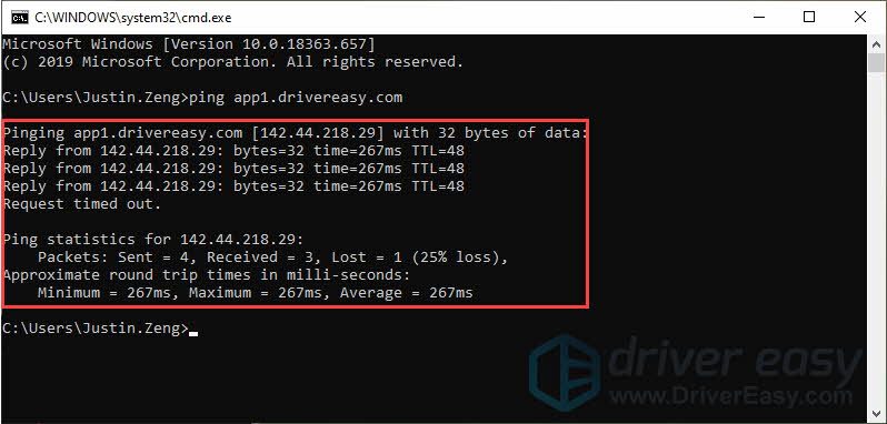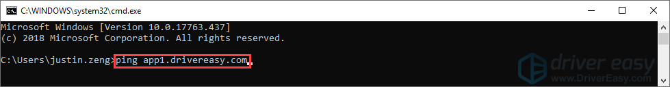2) On your keyboard, type ping app1.drivereasy.com and press Enter.