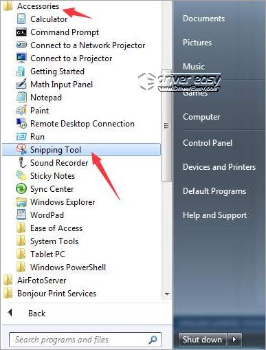 2) Navigate to All Programs -> Accessories. Then click Snipping Tool. (See the screenshot below)