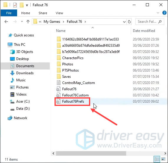 - On your keyboard, press the Windows logo key and E at the same time to open File Explorer. Then type Documents\My Games\Fallout 76 in the address bar.