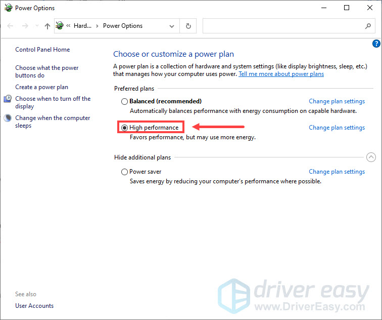 - Under Preferred plans, select High performance. (If you don’t see it, expand Hide additional plans.)