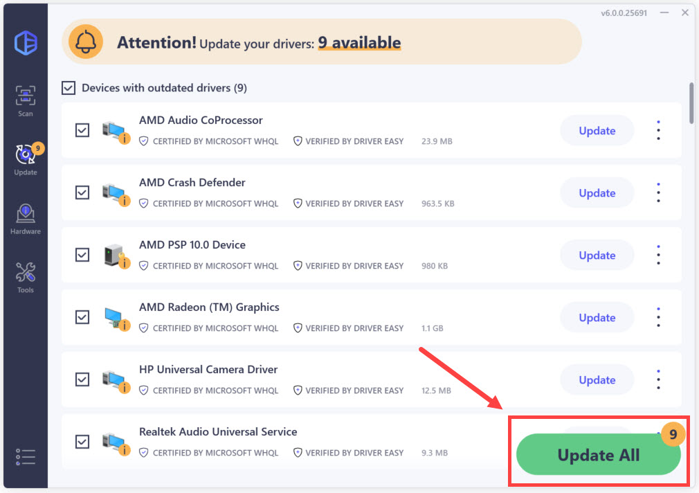 (This requires the Pro version which comes with full support and a 30-day money-back guarantee. You’ll be prompted to upgrade when you click Update All. If you’re not ready to buy the Pro version, Driver Easy offers a 7-day free trial which includes access to all the Pro features such as high-speed download and one-click install. You won’t be charged anything until your 7-day trial has ended.)