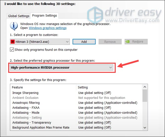 - Choose High-performance NVIDIA processor as the preferred graphics processor for Hitman 3.