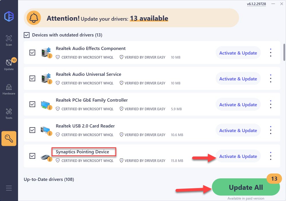 3) Check the scan results to see if your Synaptics device is flagged as outdated. If yes, you can update it automatically using either the Free Trial or Pro version.