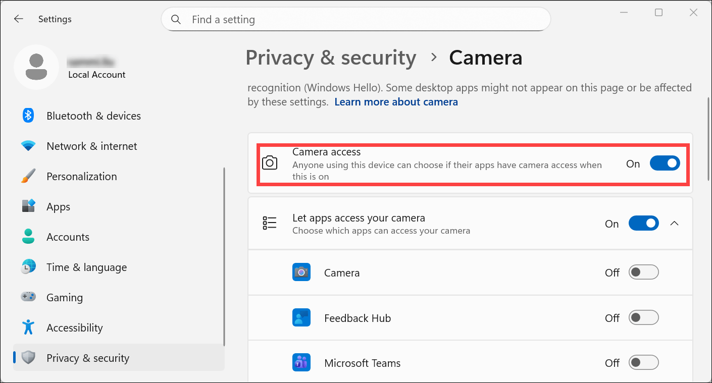 - Navigate to the Camera tab. Then click the Change button and turn on the Camera access for this device.