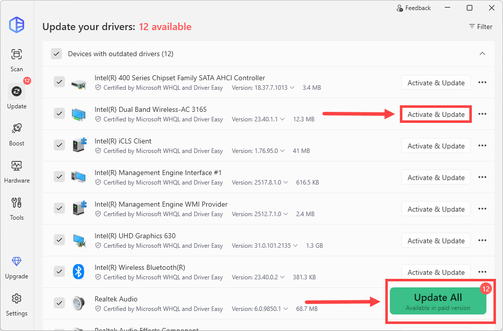 - Click the Activate & Update button next to any flagged driver to automatically update the correct version of that driver. Or click Update All to automatically download and install the correct version of all the drivers that are missing or out of date on your system.
