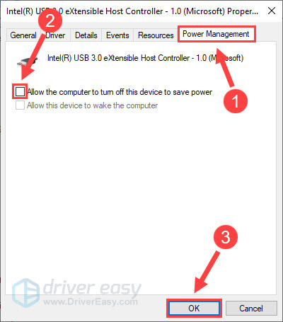 - Select the Power Management tab. Untick Allow the computer to turn off this device to save power and click OK to save the changes.