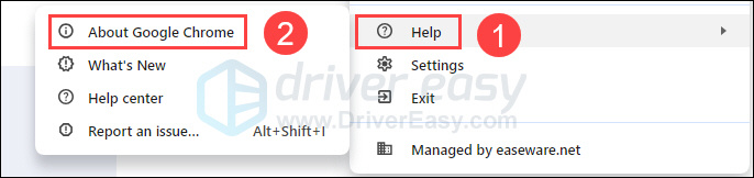 1) Click the three-stacked-dots icon at the top right corner of your Chrome browser. Then select Help > About Google Chrome.