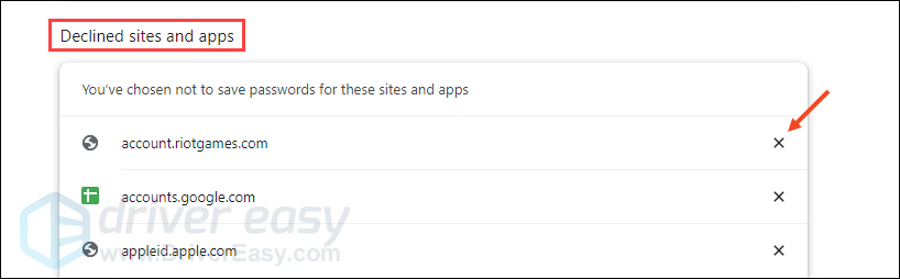 3) Scroll down the page and take a look at the Declined sites and apps section. If you notice any sites banned from saving your passwords – which is not what you want – simply remove it from the list by clicking the Cancel icon.