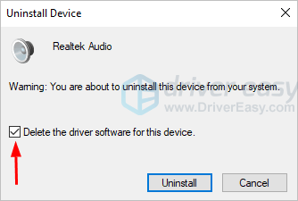 4) Once you get the prompt to ask you to confirm the uninstall, click Uninstall. If you see a checkbox “Delete the driver software for this device”, select it then click Uninstall.