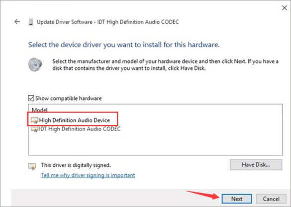 - Select High Definition Audio Device (Not IDT High Definition Audio CODEC) and click the Next button. A warning message might pop up, just click the Yes button. Then the driver will be installed successfully.