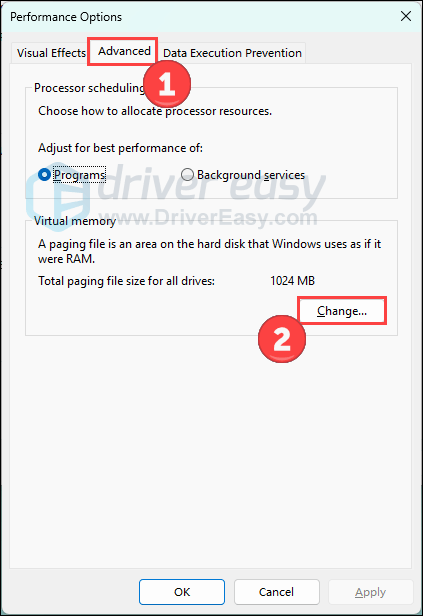 3) Go to the Advanced tab again, and choose Change… in the Virtual memory section.