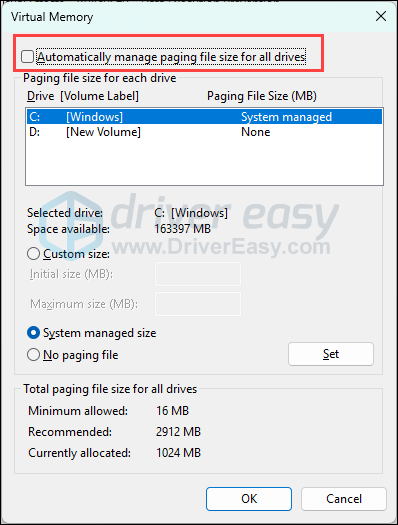 4) Ensure the Automatically manage paging file size for all drives checkbox is NOT ticked.