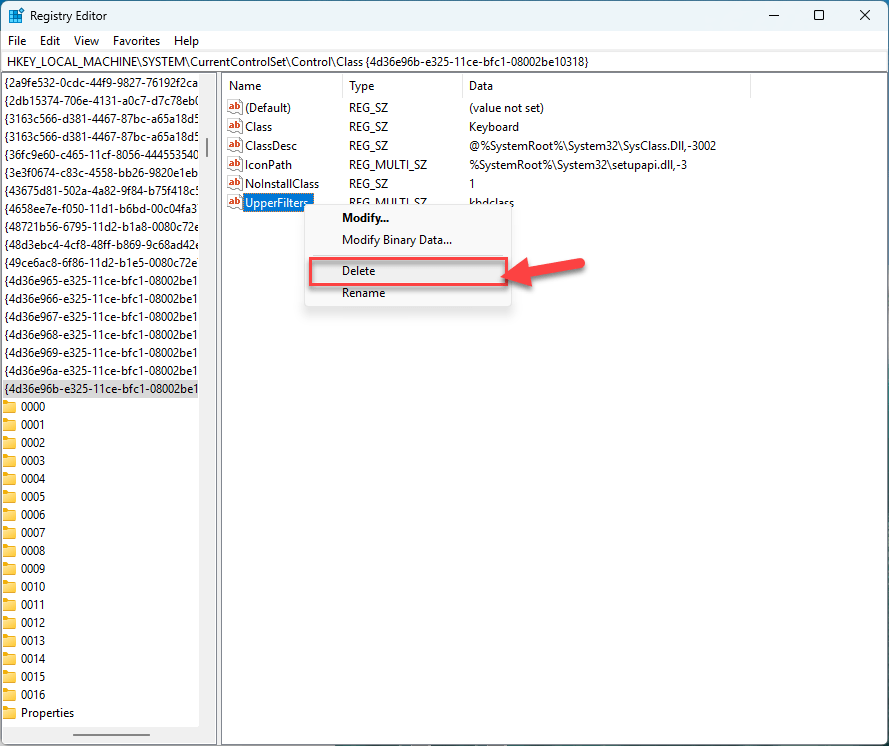 Then press Enter to navigate to that registry key. - With the correct registry key selected, look in the right-hand pane. If you find UpperFilters or LowerFilters values, right-click each one and select Delete. If only one is present, delete that one. Confirm the action when prompted.