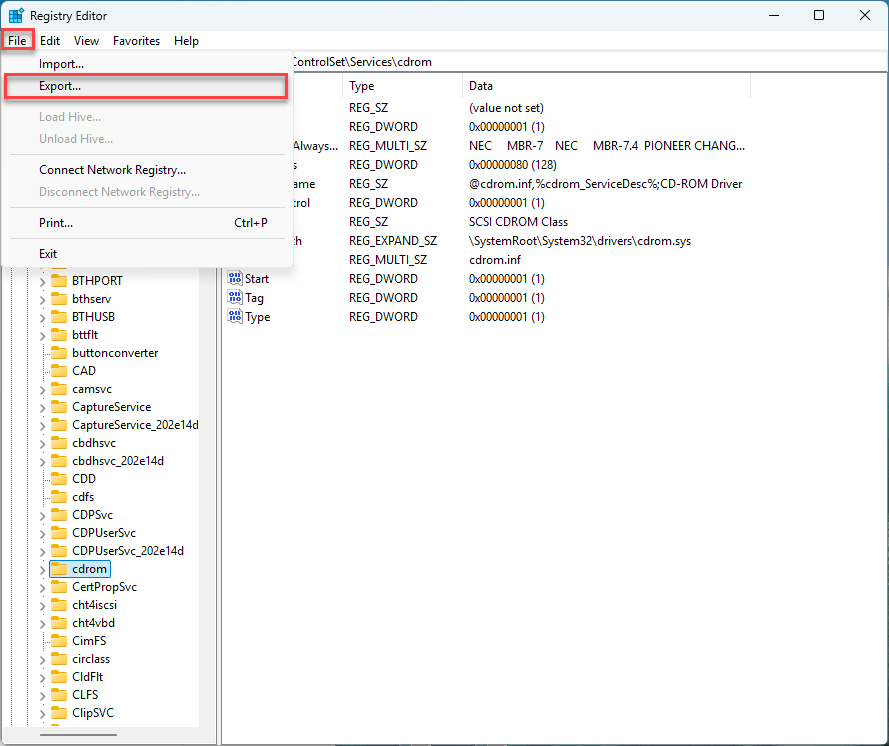 - In Registry Editor, click File > Export.