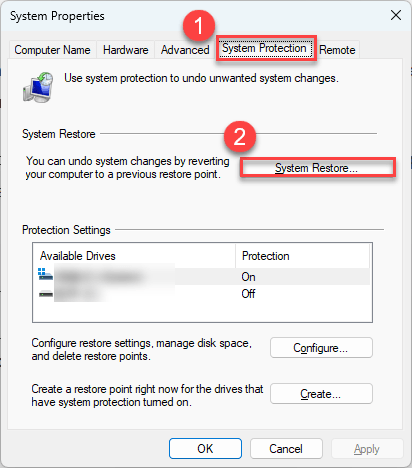 - Under the System Protection tab, click System Restore.