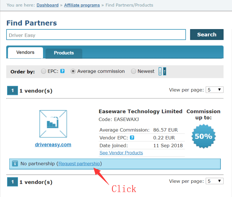 4) Click Request partnership link (under “Easeware Technology Limited” in the Vendors tab).