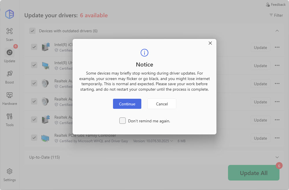 We’ve added a new notice that pops up before you update all your drivers. It will warn you about temporary interruptions like a flickering screen or a short internet disconnect, so you know exactly what to expect. This helps you save your work and plan your updates without any surprises.