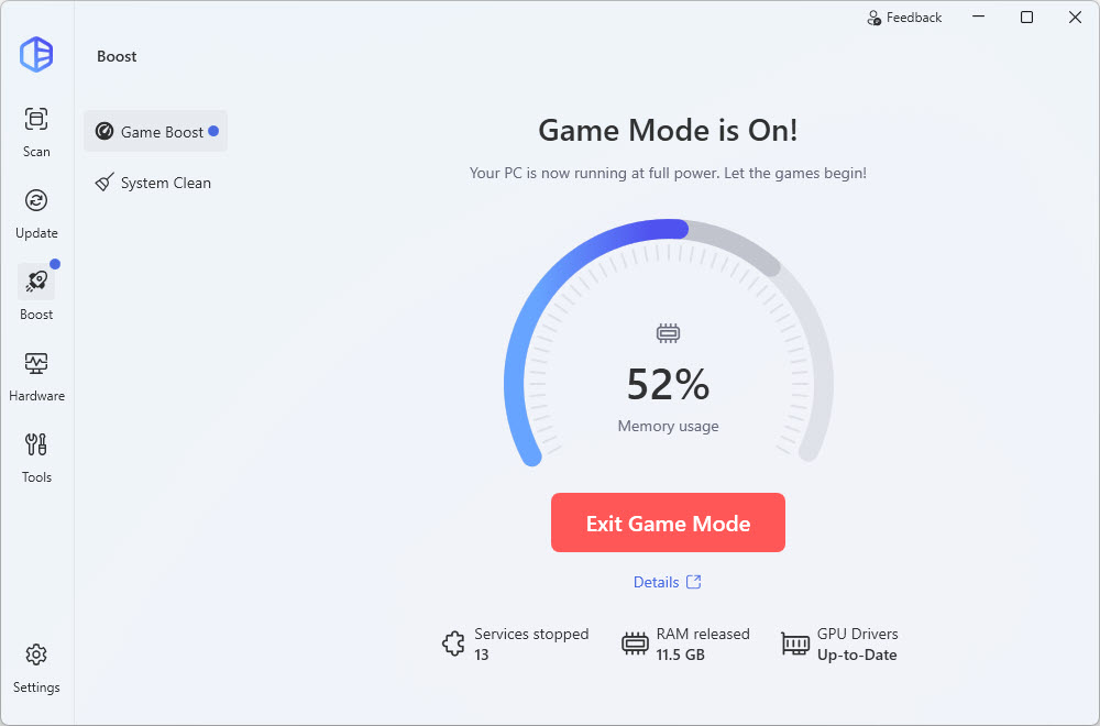 With Game Boost, you can customize which optimizations to apply—choose from up to 13 non-essential Windows services and six system tweaks, including freeing up RAM, clearing clipboard memory, enabling Game Mode, adjusting power settings, and disabling telemetry and the Windows key. All changes are automatically restored when you exit Game Mode.