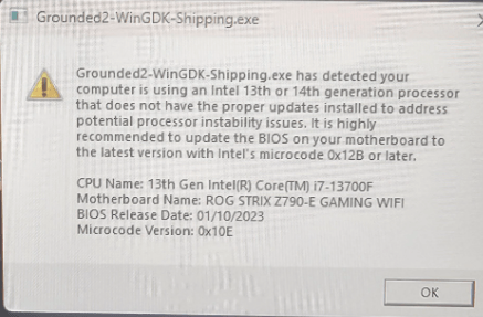 If you’re using an Intel 13th or 14th generation processor, you probably receive the error message “Grounded2-WinGDK-Shipping.exe has detected your computer is using an Intel 13th or 14th generation processor that does not have the proper updates installed to address potential processor instability issues. “