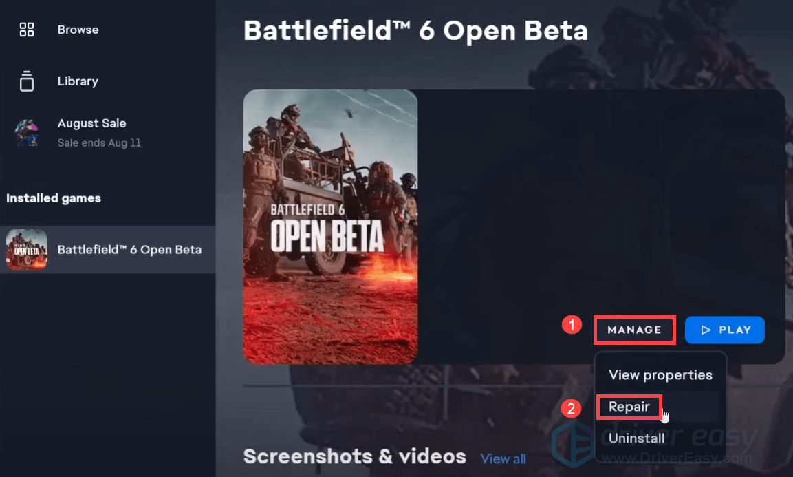 - Find your game, then click MANAGE > Repair.