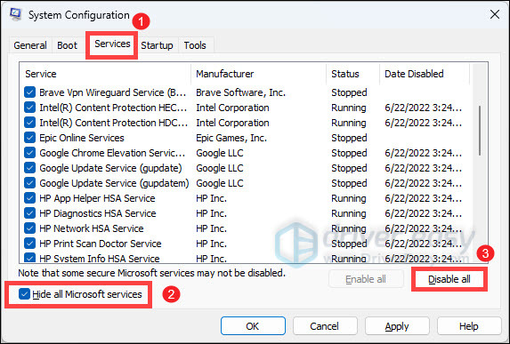 - Select the Services tab, check the box next to Hide all Microsoft services so that you don’t accidentally disable a key process, and then click Disable all. After that, click Apply.