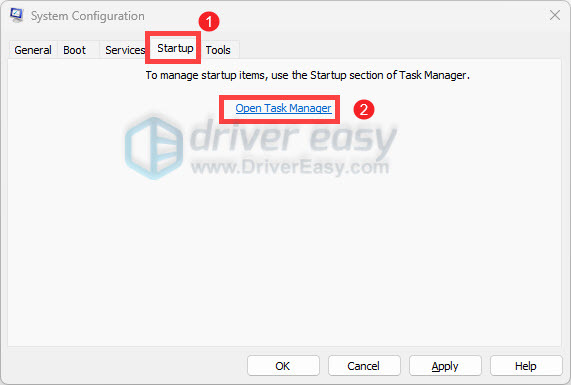 - Click on the Startup tab and click Open Task Manager.