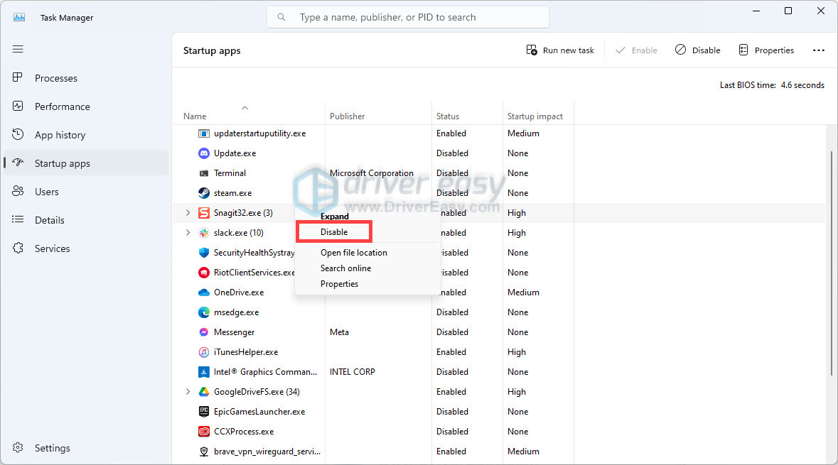 - Right-click each enabled startup item and select Disable.