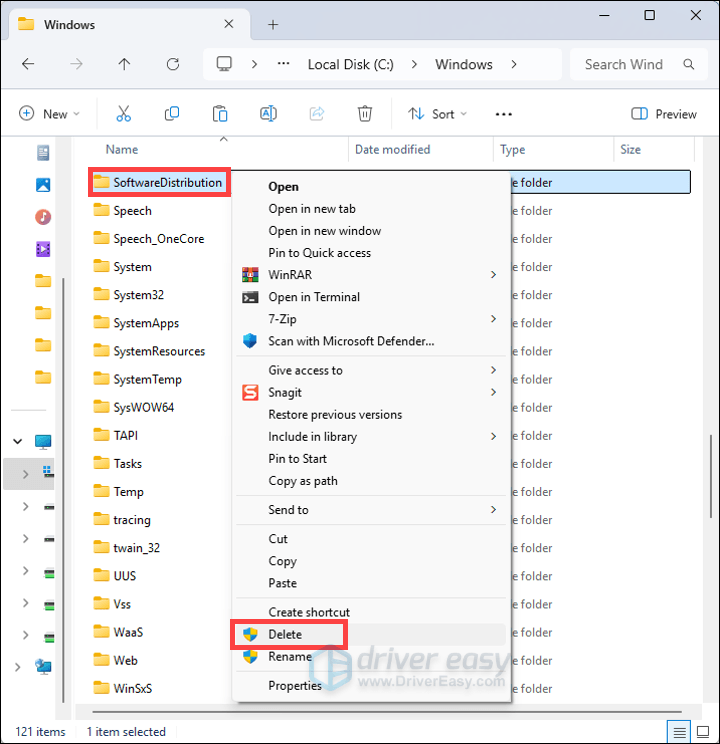 - Navigate to C:\Windows\SoftwareDistribution. Delete all files and folders inside this directory.