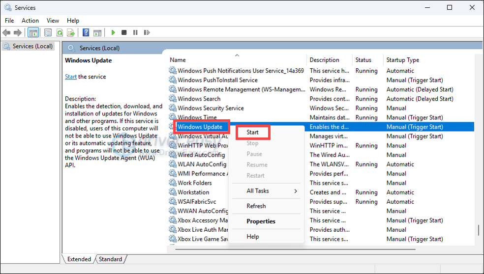 - Go back to the Services window, right-click Windows Update, and select Start.