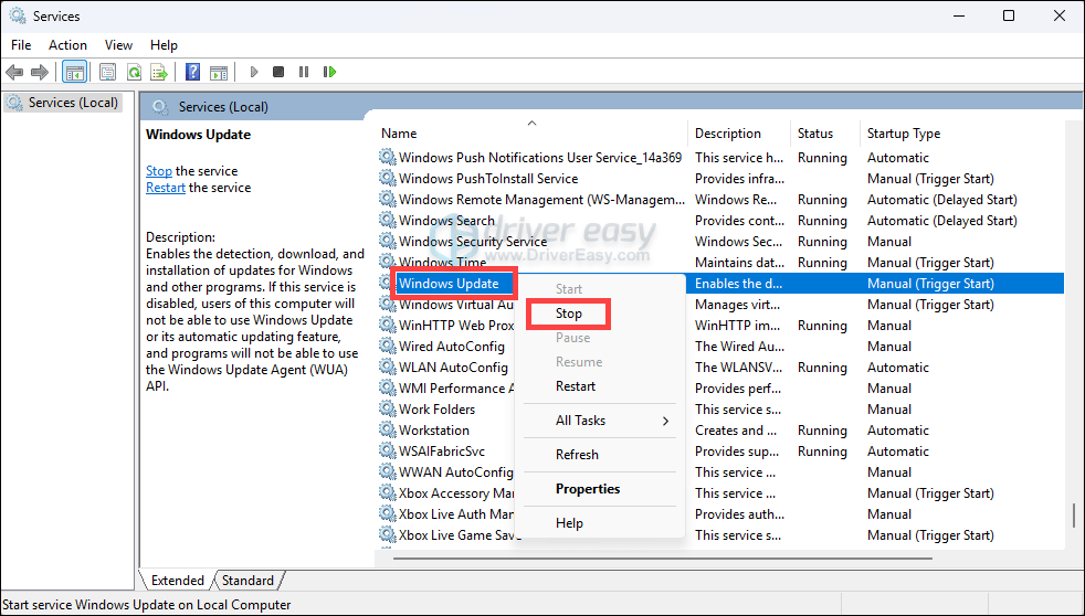 - Locate the Windows Update service, right-click it, and select Stop.