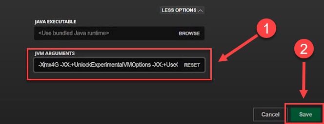 - Under the JVM Arguments section, there’s a line of text. Enter the number of RAM that Minecraft can utilize after Xmx (for example, Xmx4G means Minecraft is allowed to use 4GB RAM). Then, click Save.