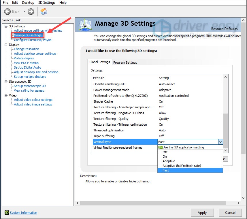 - Choose Global Settings, then find Vertical sync and click the drop-down menu on the right. Select Off and click Apply.